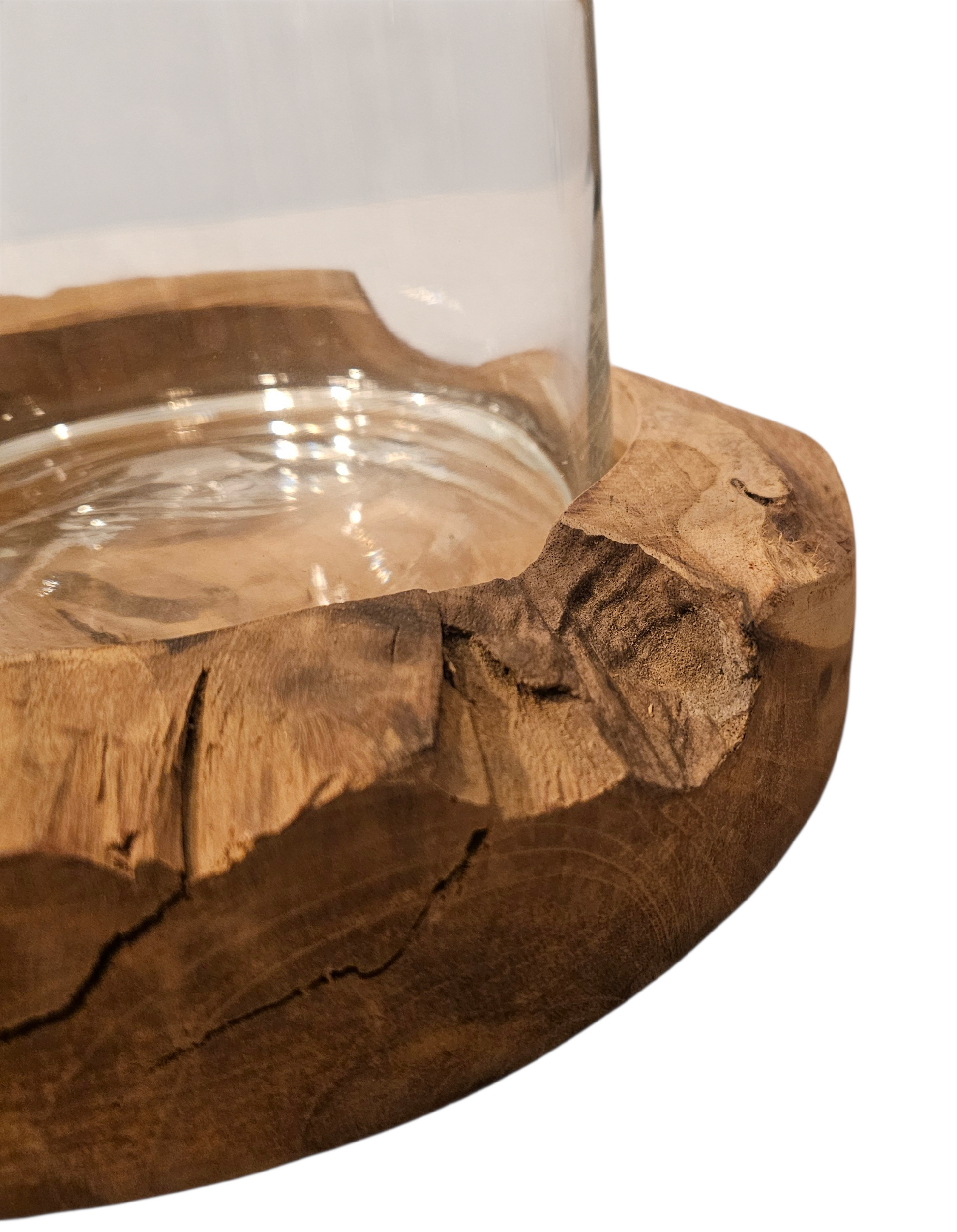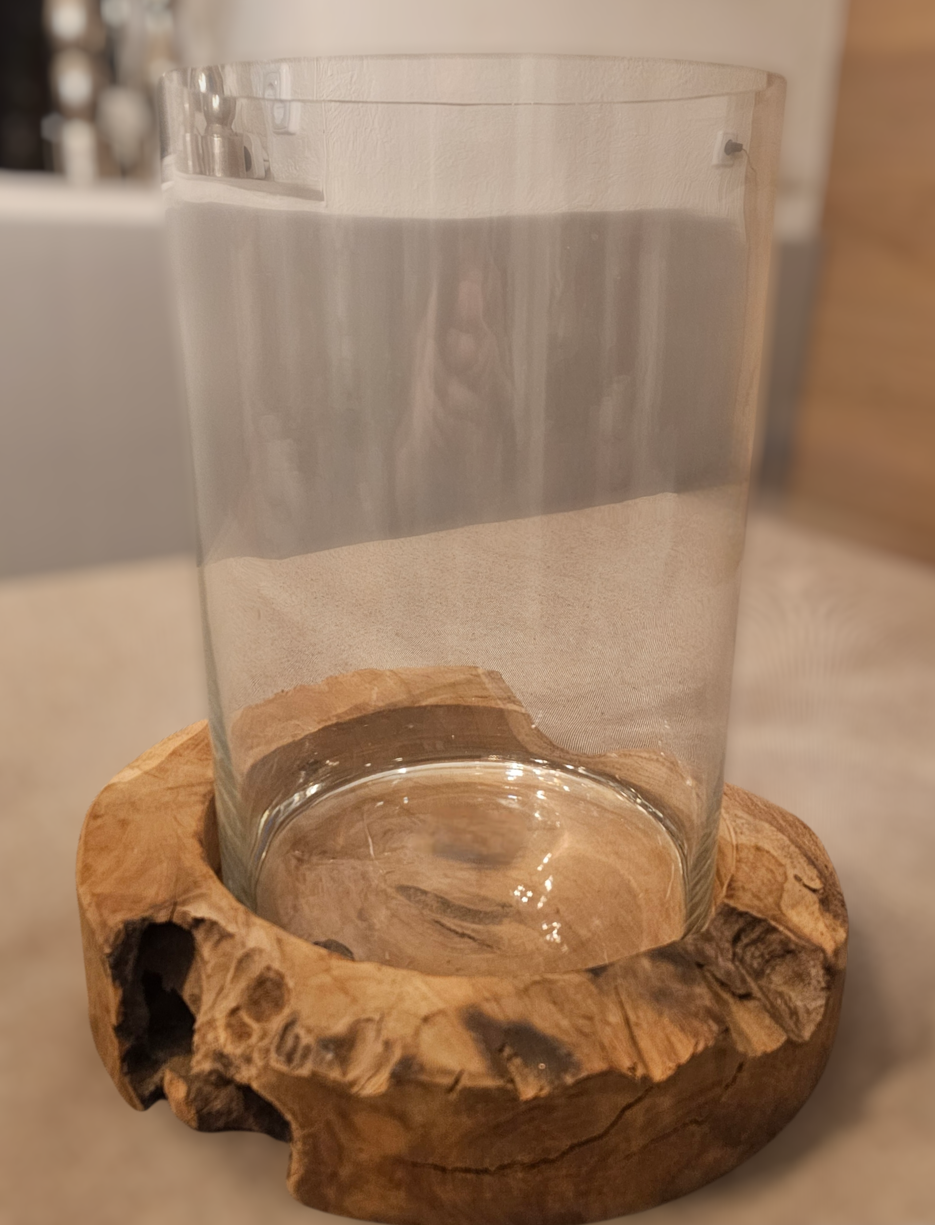 Windlicht 2 teilig Glasvase auf rustikaler Holzschale. Ein echter Blickfang in jedem Raum. Perfekt für alle, die nach einem besonderen Designstück suchen, das ihre Einrichtung aufwertet.